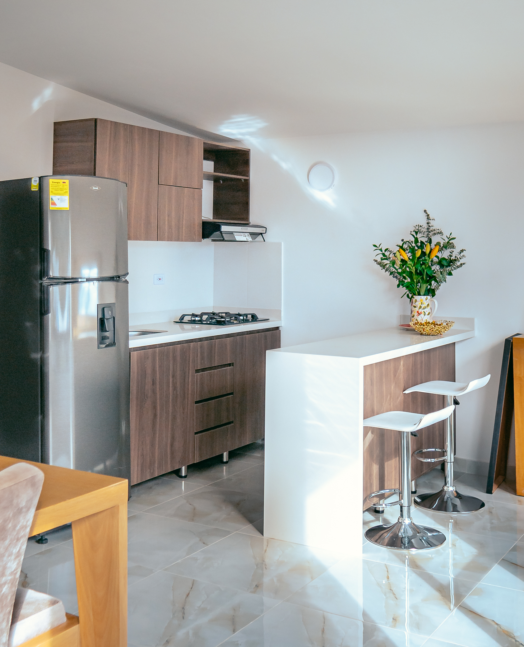 En este proyecto, destacamos la elegancia y el diseño moderno, utilizando tonos pastel en combinación con acabados y accesorios en tonos negros. El uso de piedra sinterizada en el mesón de cocina y la barra aportó un estilo premium y sofisticado, elevando la atmósfera del hogar a un nivel de distinción y refinamiento. Cada elemento fue seleccionado para lograr un equilibrio entre funcionalidad y estética, brindando un espacio elegante y contemporáneo que refleja el gusto y las aspiraciones de sus propietarios.